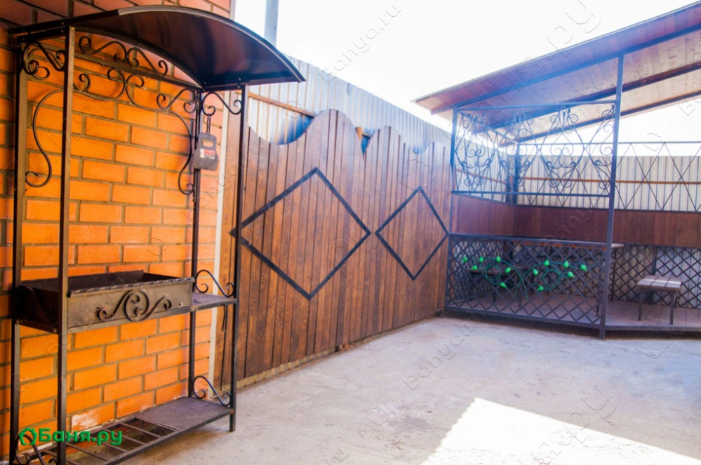 Русская банька на березовых дровах. Беседка с мангалом во дворе русской бани