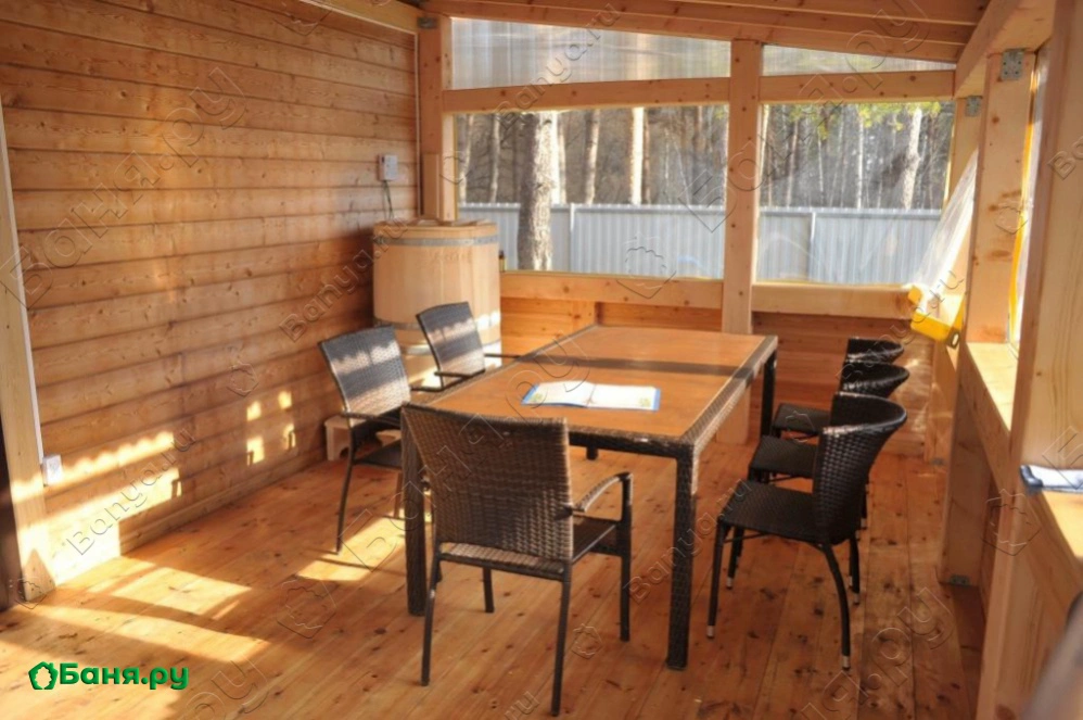 В нашей большой парилке на всех хватит жара, можно собирать компанию до 10 человек. Для любителей русских добрых традиций мы заготовили березовые веники и подвесили кадушку с ледяной водой. Во дворе установлен небольшой бассейн, стилизованный под бочку. Кроме того, для разнообразия ощущений Вас ждет фитобочка. На втором этаже расположена уютная комната отдыха и балкон. Проникнетесь волшебством лесного пейзажа: сосны, березы - все, что так близко русскому человеку. Благодать! Но это еще не все. Гостей у нас принято встречать подарками. Если Вы приедите повеселиться вместе с большой дружной компанией, мы угостим Вас чудодейственным напитком, который готовится по секретному рецепту. Те, кто успел попробовать, говорят, что получили эффект энергитического заряда! Если решите отдохнуть со своей семьей и детьми, то для Вас мы приготовим вкуснейший русский квасок или морс, выбирать Вам!