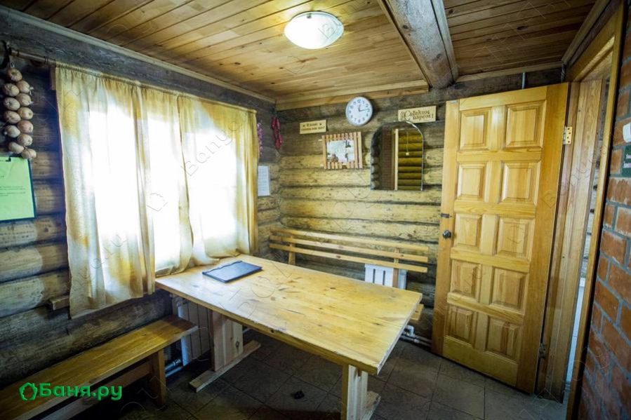 В бане имеется: раздевалка, комната отдыха со столом и двумя лавками, телевизор, душ, туалет, парная. В парной находится печь каменка, которая топится дровами с улицы. Можно приобрести тапки на четыре человека, банные шапочками и рукавицами. Так же имеется веранда с лавкой.