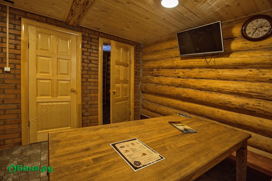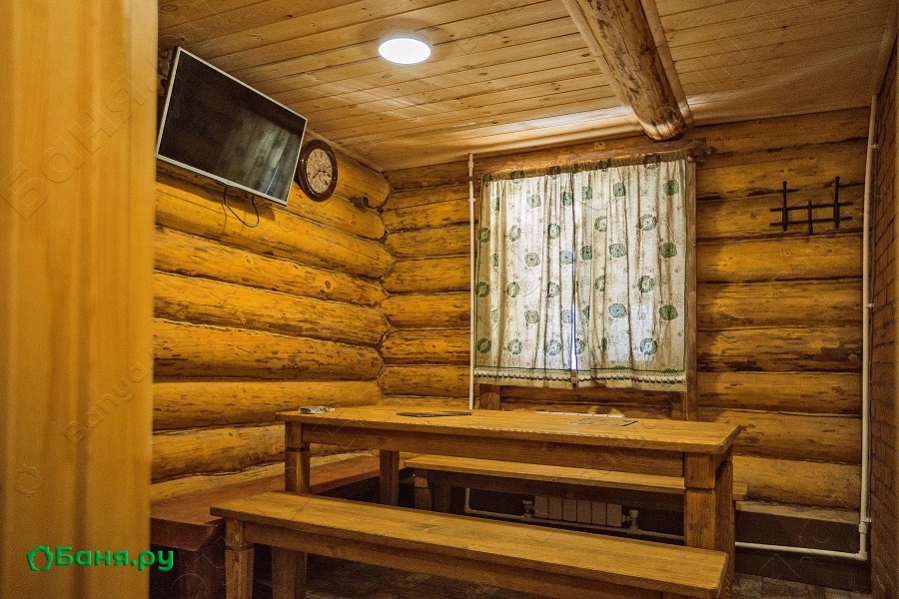 В бане имеется: раздевалка, комната отдыха со столом и двумя лавками, комната с двуспальной кроватью, телевизор, душ, туалет, умывальник, парная. В парной находится печь каменка, которая топится дровами с улицы. Можно приобрести тапки, банные шапочками и рукавицами. Так же имеется большая веранда с лавкой с видом на озеро.
