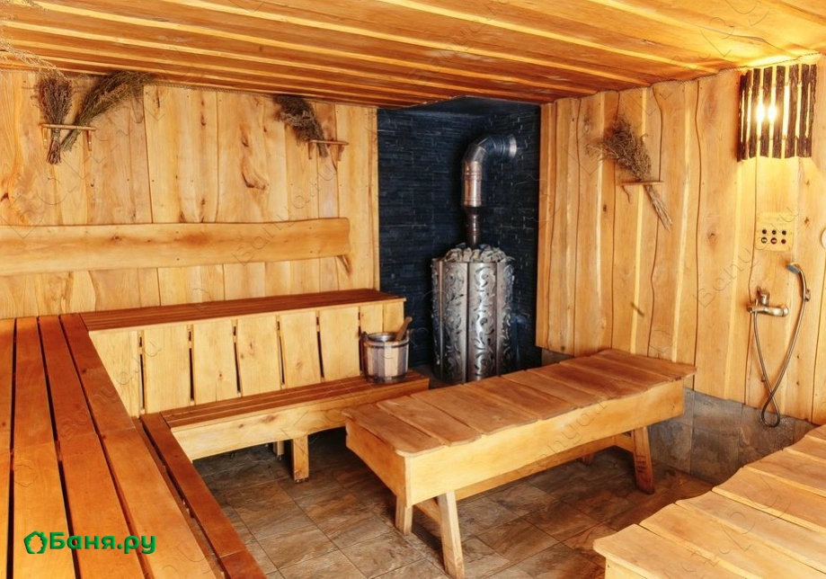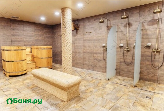 помывочное отделение оснащено купелями, подогреваемыми лавками, обливными ведрами и системами "ливень".