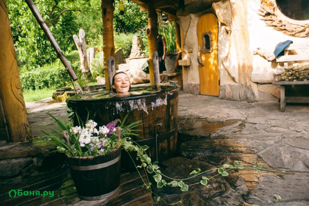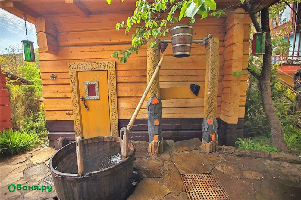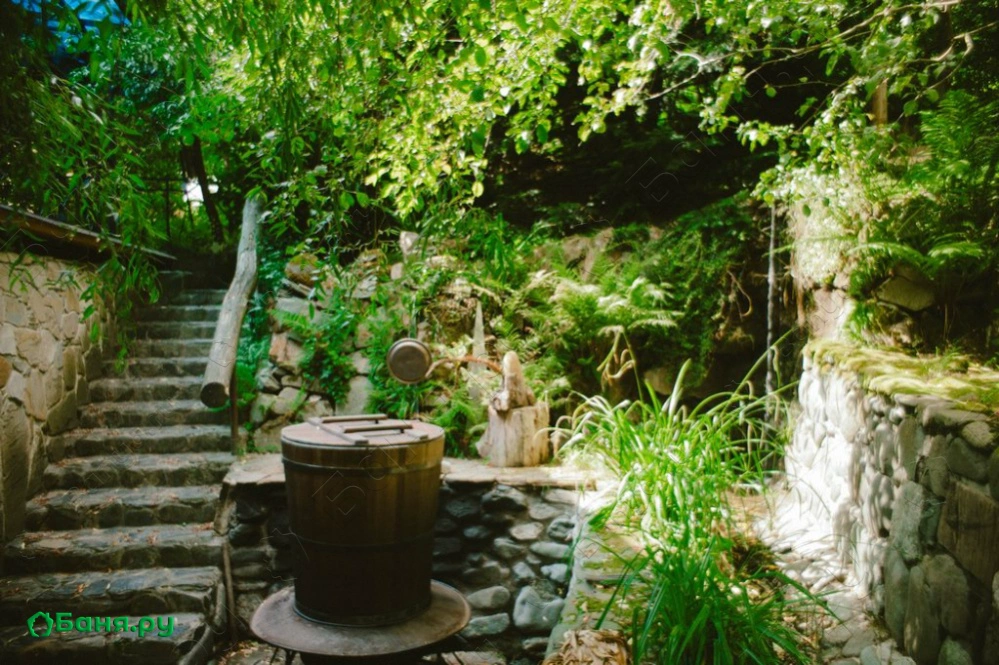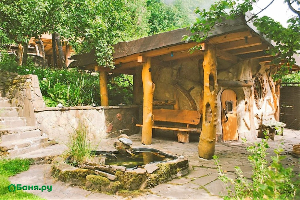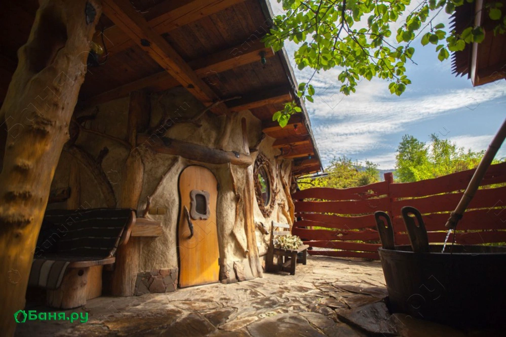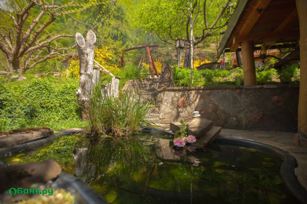 Уникальная парная-«мазанка» с каркасом из стволов груши и травяной крышей как будто выросшая из земли, расположилась под большой и старой яблоней. Топится она «по-чёрному». Пар в такой парной легкий и наполнен кислородом, что создает во время парения ощущение погружения, исчезновения и растворения. Окунание в большую дубовую бочку с холодной родниковой водой после парения приведет Вас к взрывным ощущениям. После холодной воды погрузиться в большой, на 2 тонны, чан воды, подвешенный на цепях над живым огнем. Укрытые пледом, на качелях-полатях Вы унесетесь в мир грез и соединитесь с природой. Отличительная особенность Комплекса — это специальное помещение с подогреваемыми фито-ваннами и обертыванием в распаренное сено.
