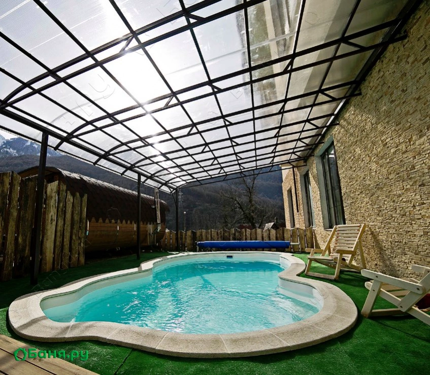 г. Сочи, Красная поляна, ул. Комсомольский переулок, 4а На территории комплекса функционирует финская сауна, которая отличается от русской бани тем, что ее температура может достигать 130-160 градусов. Так же они различаются по влажности воздуха: если в русской бане этот показатель достигает 90%, то в финской сауне влажность не больше 20-25%. Должны отметить, что польза от русской бани и финской сауны практически одинаковы, как и сам процесс, который приносит массу удовольствия. В стоимость сауны входит посещение открытого бассейна с видом на горы.