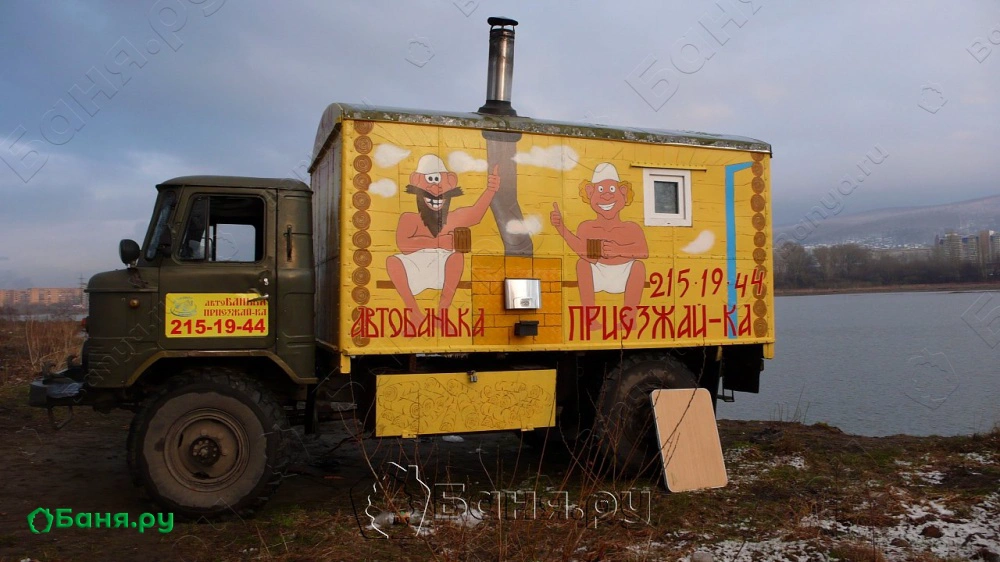 г. Красноярск, ул. Сибирская, 92АвтоБанька Приезжай-ка - передвижная баня. Это новая услуга для любителей активного отдыха, позволяющая в любом доступном или труднодоступном месте: на охоте, рыбалке, при сплаве по горным рекам, на любых туристических маршрутах насладиться крепким сибирским паром с веничком, жадеитовой каменкой и всеми прелестями русской бани. АвтоБанька Приезжай-ка приедет в ЛЮБОЕ место вашего отдыха, поскольку построена на базе вездехода ГАЗ 66. Активный отдых в Красноярске, доставка бани для туристов, любителей рыбалки на горных маршрутах, выезд возможен в любой район города и за его пределы.