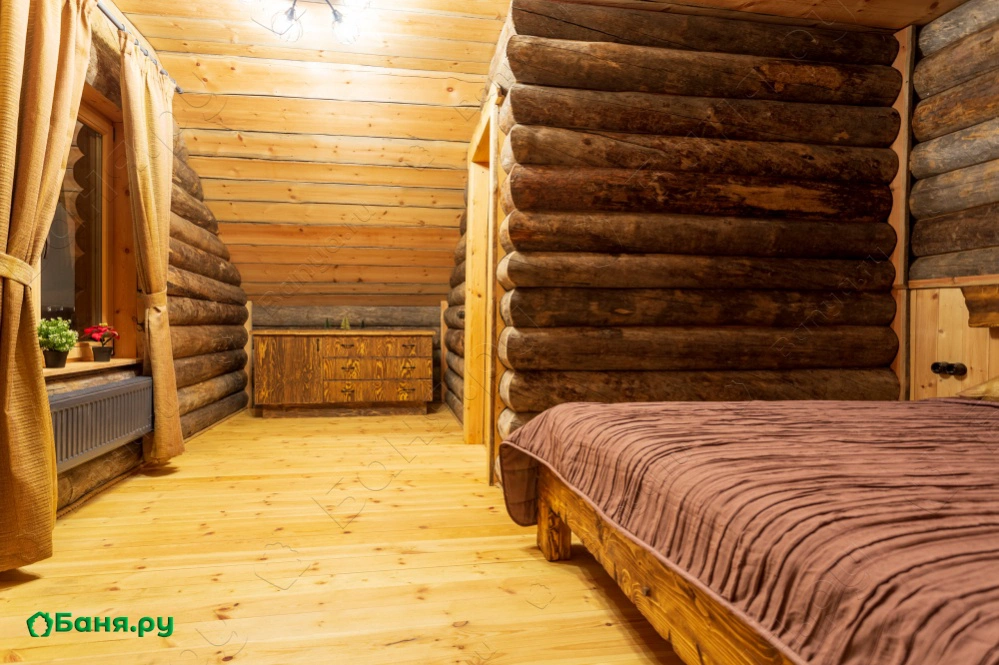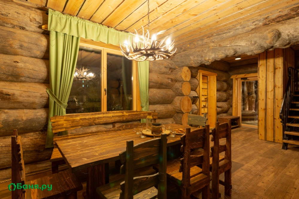 Двухэтажный дом выполнен из карельской сухостойной сосны возрастом более 150 лет. Средний диаметр бревна составляет 60 см. Общая площадь дома 185 м2: