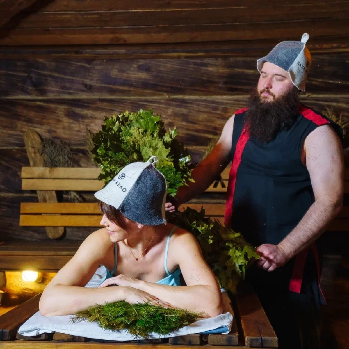 Включено: 4 шт. - дубовые веники (для парения); 2 шт. - пихтовые веники (для лица); 3 шт. - травяные веники (для аромата); 2 шт. - березовые веники (для подложки); 4 шт. - ледяные утюжки (для обтирания); 2 шт. - махровый халат, самовар со отваром, угощения на стол.