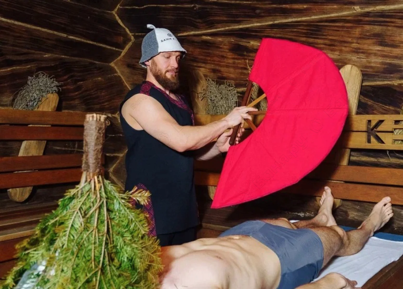 Парение ОЧИЩАЮЩЕЕ - массаж тела можжевеловым веником и топором. Включено: 2 шт. - дубовые веники (для парения); 2 шт. - пихтовые веники (для лица); 2 шт. - травяные веники (для аромата); 2 шт. - можжевеловые веники (для массажа).