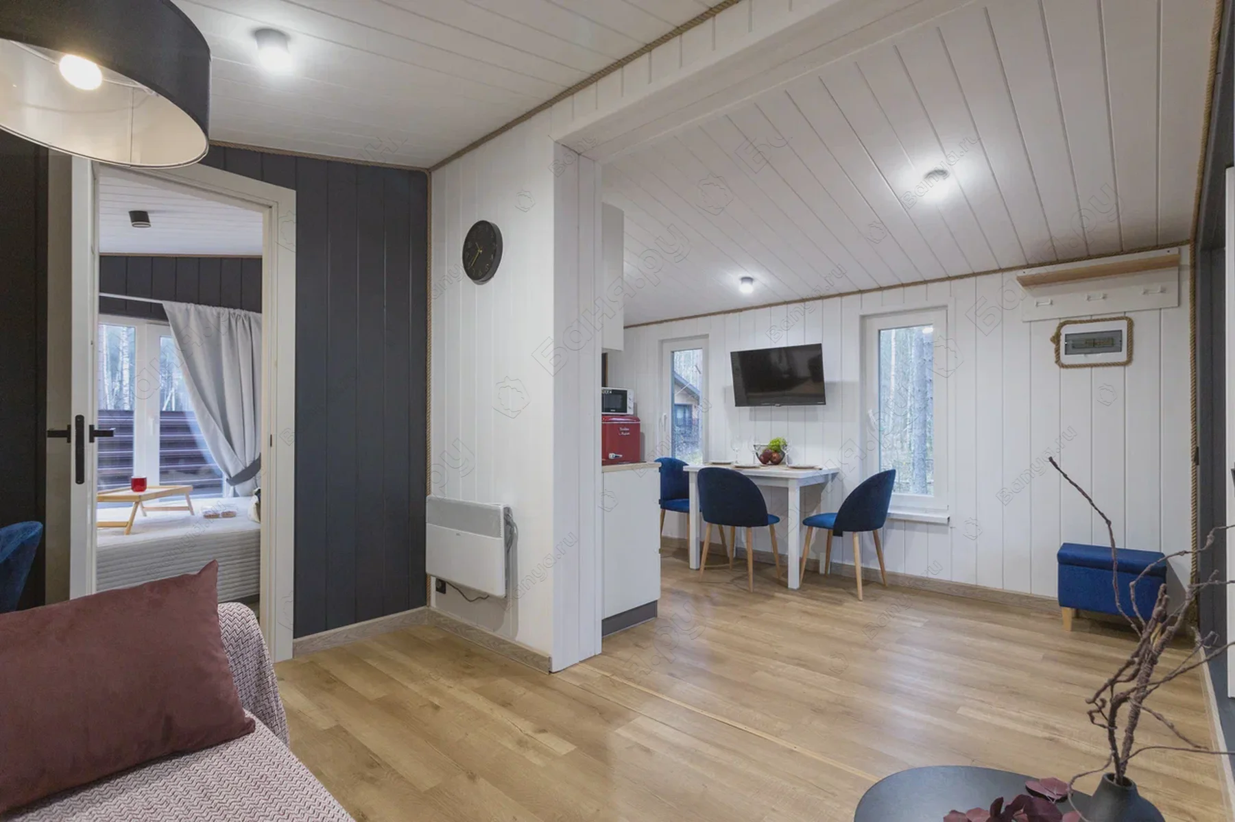 - При бронировании дома на двоих гостей, спящих на разных местах (один — на кровати, другой — на диване), за второй комплект постельного белья также взимается плата — 500 ₽.