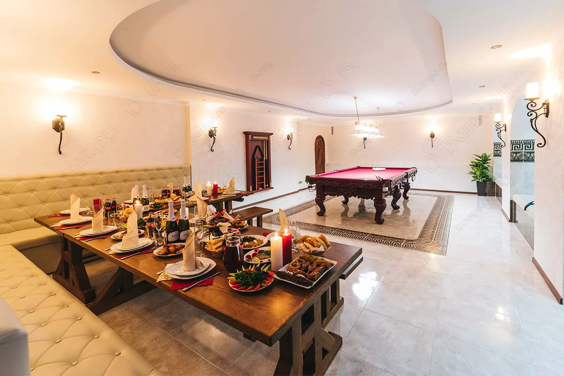 Мы рады предложить своим гостям большой выбор блюд русской, европейской и восточной кухни, а также широкий выбор алкогольных и безалкогольных напитков. Уточняйте подробности у администратора.
