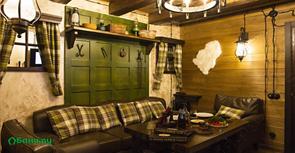 г. Москва, Иваньковское ш., 5 Этот номер так же выполнен в ретро стилистике, но на контрасте с номером "Прованс" выполнен в тёмной коричнего - зелённой гамме. Здесь использованы экологичные материалы, много дерева - обивка стен, кованные светильники, шкуры в сочетании с тёмной кожаной мебелью. Уютный зал с камином. Русская парилка, ТВ, муз центр, профессиональное караоке.