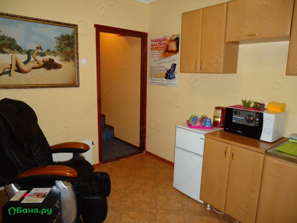 г. Мурманск, ул. Комсомольская, 15 После посещения парной гости сауны смогут остудиться в чистейшем бассейне с теплой водой, а затем переместиться в зону отдыха с удобной мебелью, телевизором и аудиотехникой с системой караоке (имеется большой выбор песен). Для желающих уединиться, чтобы отдохнуть, а может быть и подремать, в сауне предусмотрена отдельная комната отдыха с мягкой кроватью. Также в сауне есть санузел и несколько душевых кабин, а посетителям с детьми предоставляются плавательные матрацы и надувные нарукавники.
