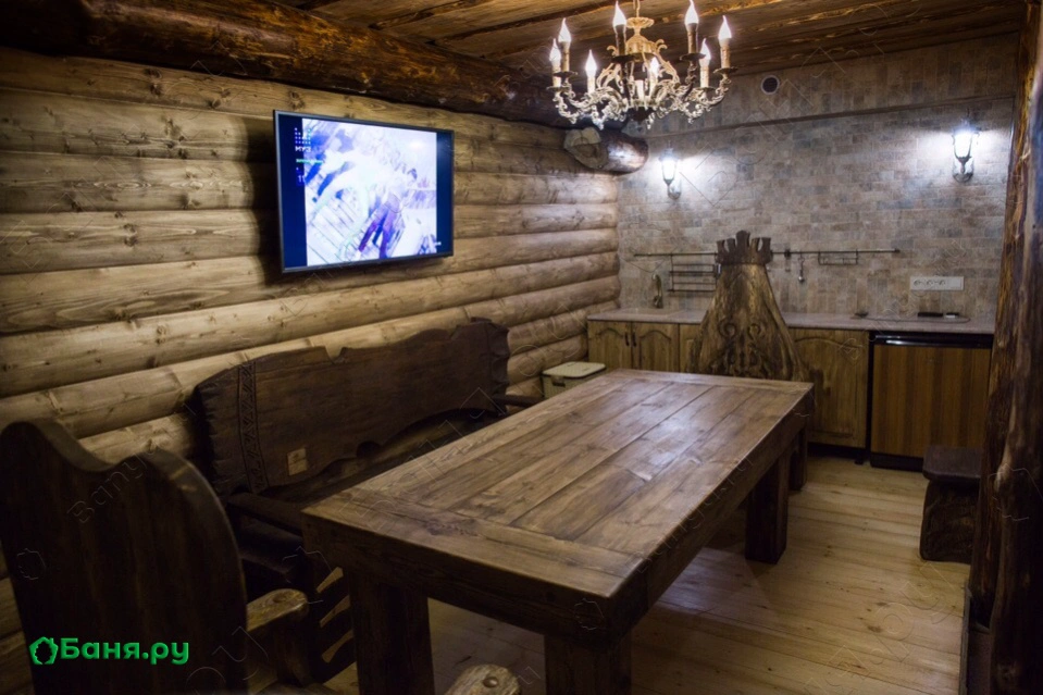 банкетный стол на 10 персон с кухонной зоной где есть всё самое необходимое (разделочная доска, штопор, солонка, холодильник, СВЧ, чайник и даже самовар на дровах)