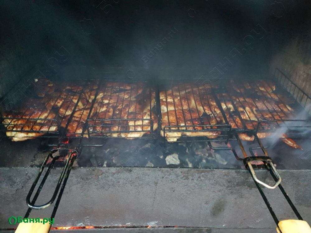 Огороженная мангальная зона, с барбекю, деревянный стол с лавками.