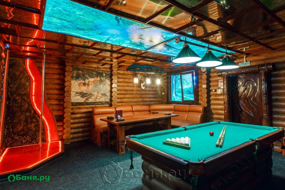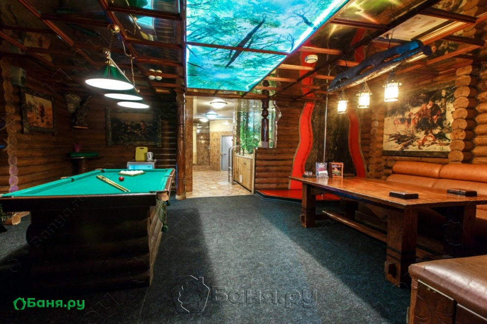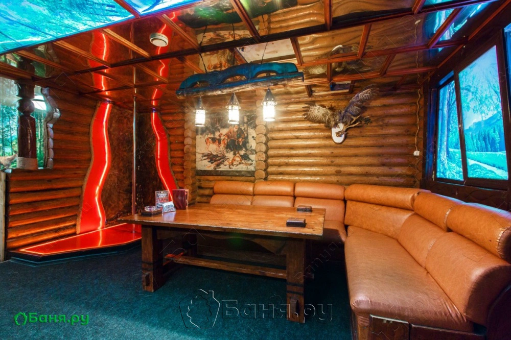 Номер пользуется большой популярностью за счет своего оформления в стиле «Охотничьей заимки». Рекомендуем для проведения торжеств и семейного отдыха.