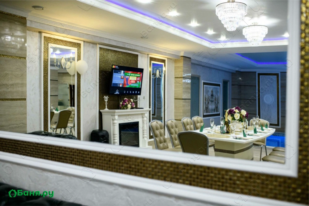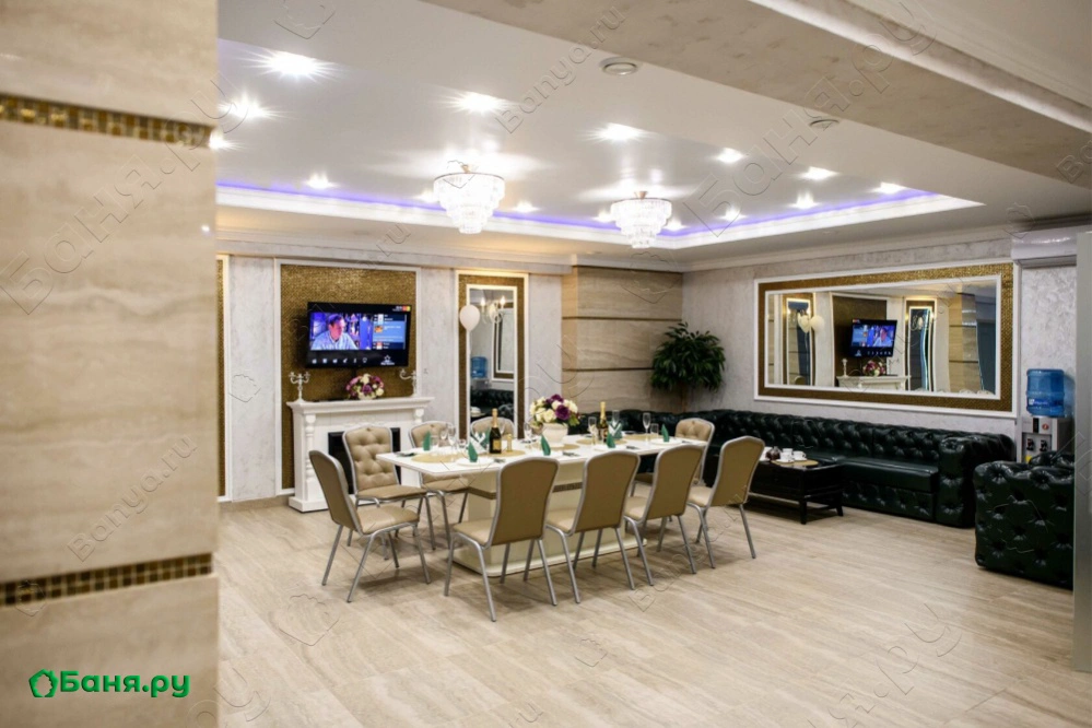 Красивый и просторный зал, вместительный стол, сервировка стола! Все это отличный бонус к бассейну и парилочке!