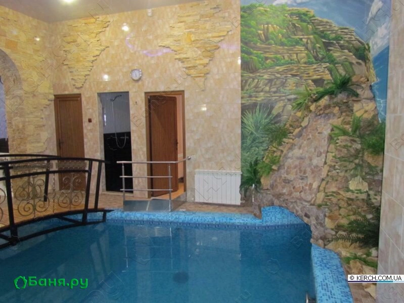 г. Керчь, ул. Орджоникидзе, 31Сухой пар, два бассейна: теплый и холодный. В теплом бассейне имеются гидромассажи, встречное течение, гейзер, водопад, а так же разные глубинные зоны (детская и взрослая). Есть ведро-водопад с проточной водой. Дополнительная комната отдыха с большой кроватью. Выход на улицу, мангал, бильярд. Веником пользоваться нельзя!