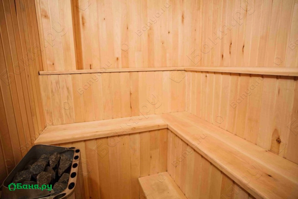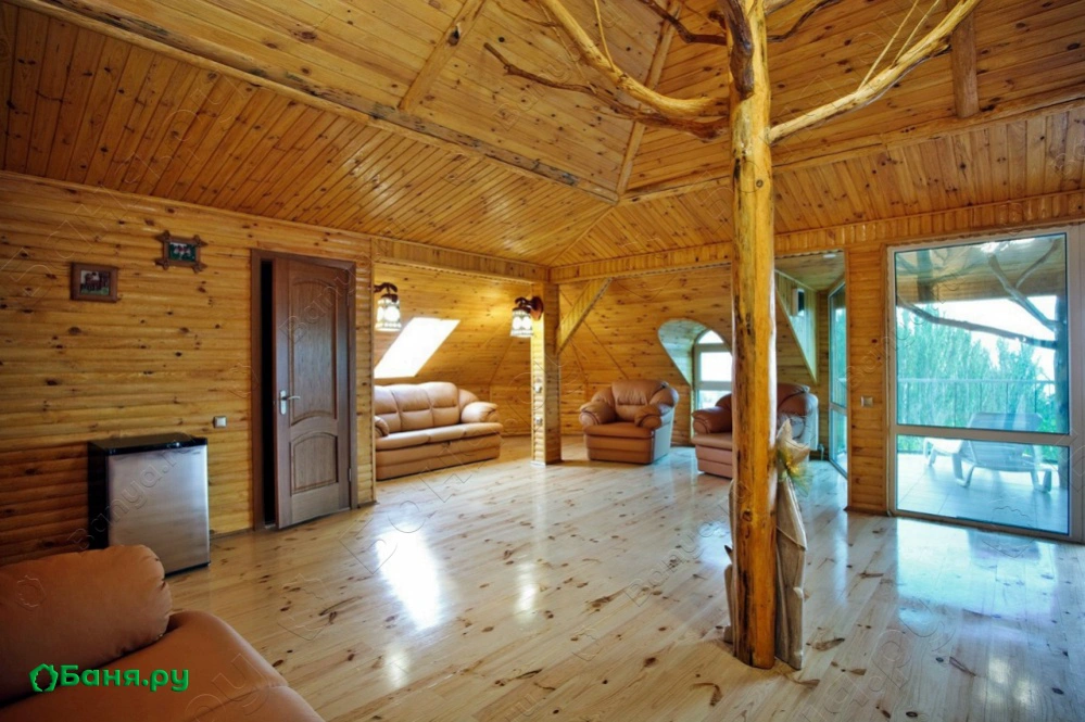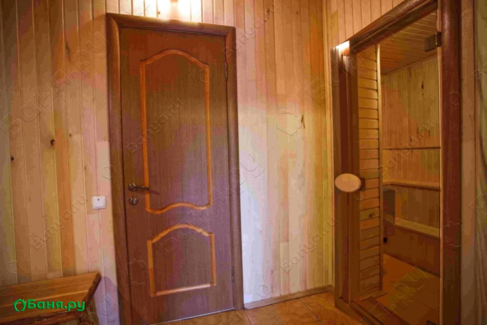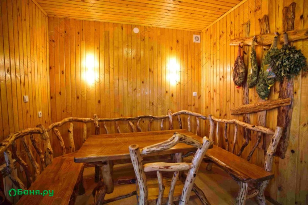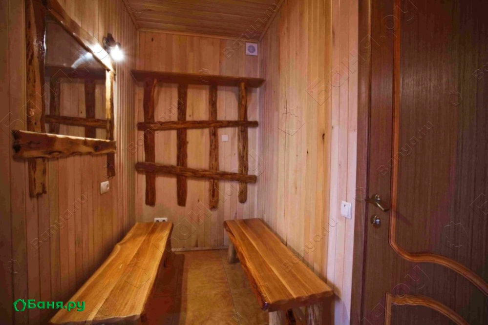 раздевалка с вешалкой и скамьей, санузел с душевой, туалетом и раковиной комната отдыха с большим столом и скамейками, телевизором и шкафчиками для посуды двухуровневая парилка (температуру пара вы сможете отрегулировать сами)