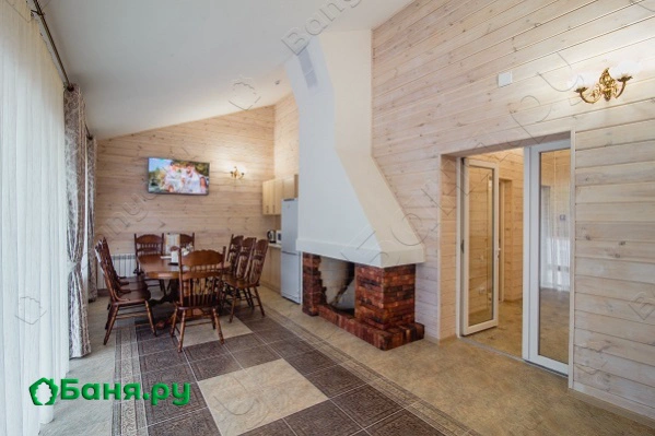 --каминный зал с пространством для отдыха, большим столом и террасой с джакузи
