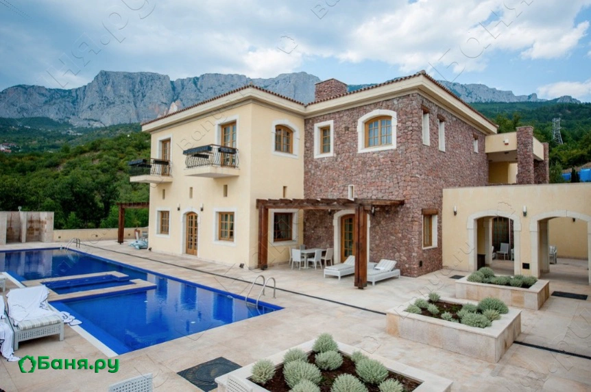 Баня рассчитана, как на пары, так и на компанию 6-8 персон. Расслабиться и насладиться восхитительным видом можно в роскошной комнате отдыха и выпить чашку горного Крымского чая.