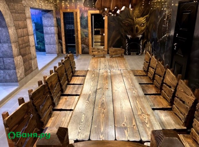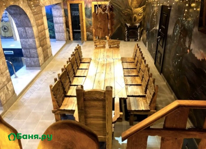 нескользящая напольная плитка автоматический приток воздуха в помещениях авторская ручная роспись на стенах стол из массива дуба на 15 посадочных мест банные принадлежности: тапочки резиновые, полотенца, простыни, одноразовые шампунь и мыло, одноразовые станки для бритья фен профессиональный, зеркало 3-х метровый водопад над бассейном