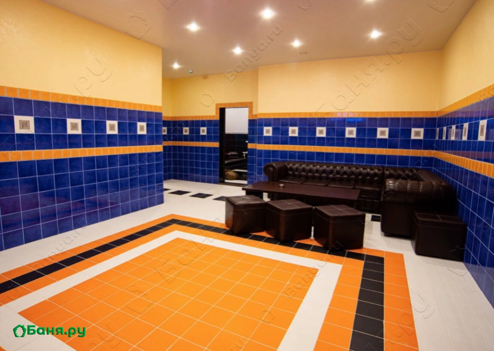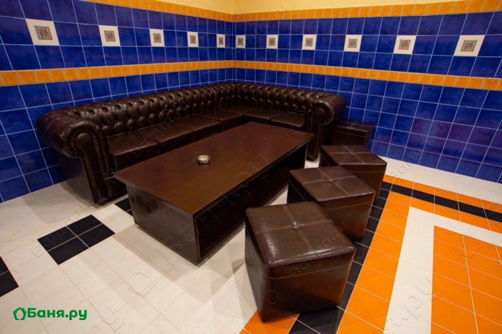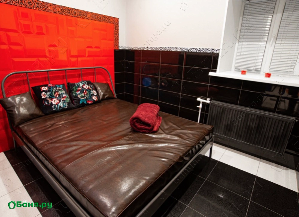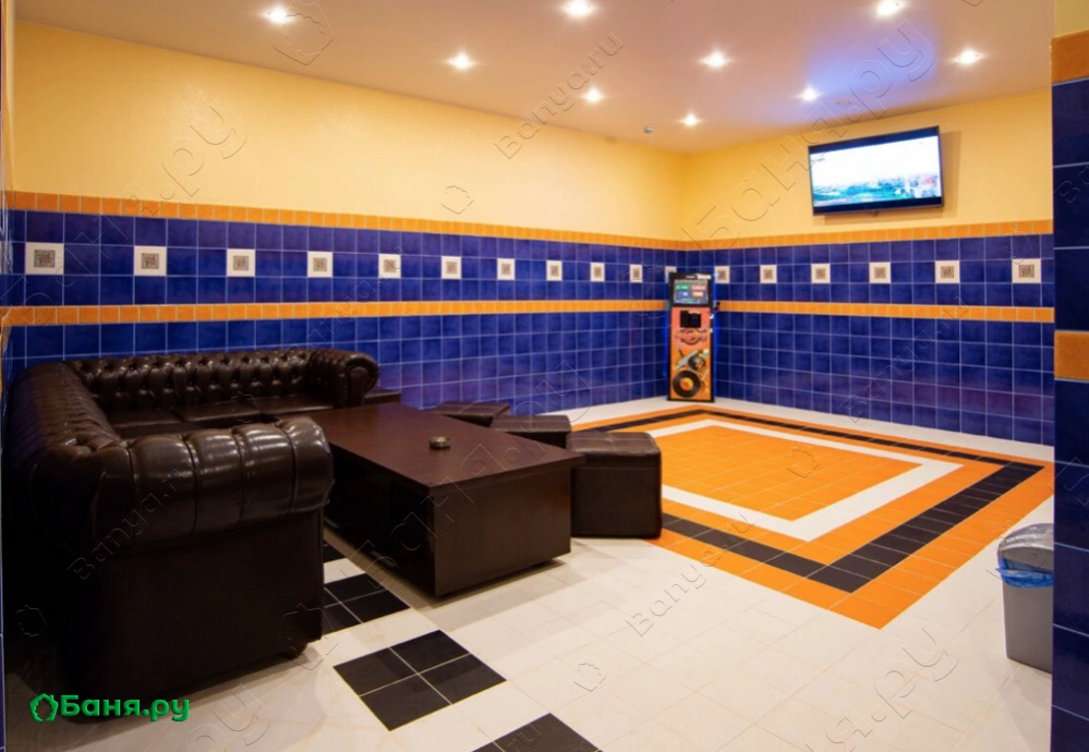 зал для банкета с кожаной мебелью, ТВ и музыкальным центром комната отдыха с роскошной двуспальной кроватью в перерывах между заходами в парную - аппаратура для караоке, кальян