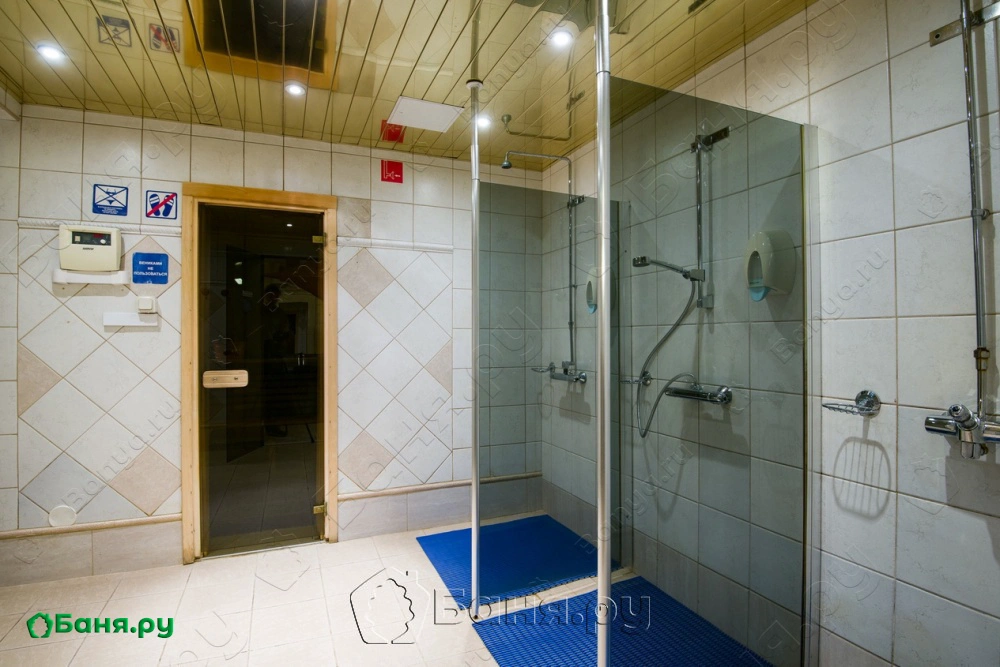 Сауна оборудована просторными душевыми кабинами и комфортной комнатой отдыха