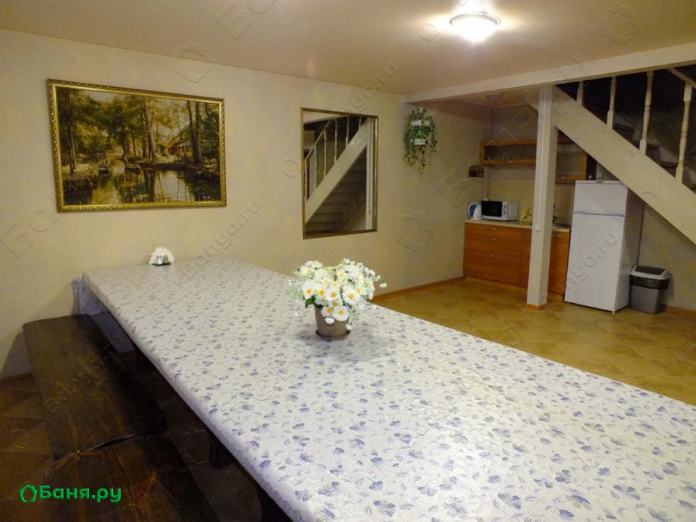 Большой зал с большим столом. На втором этаже 3 спальные комнаты (10 спальных мест).