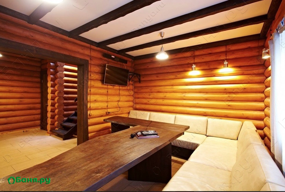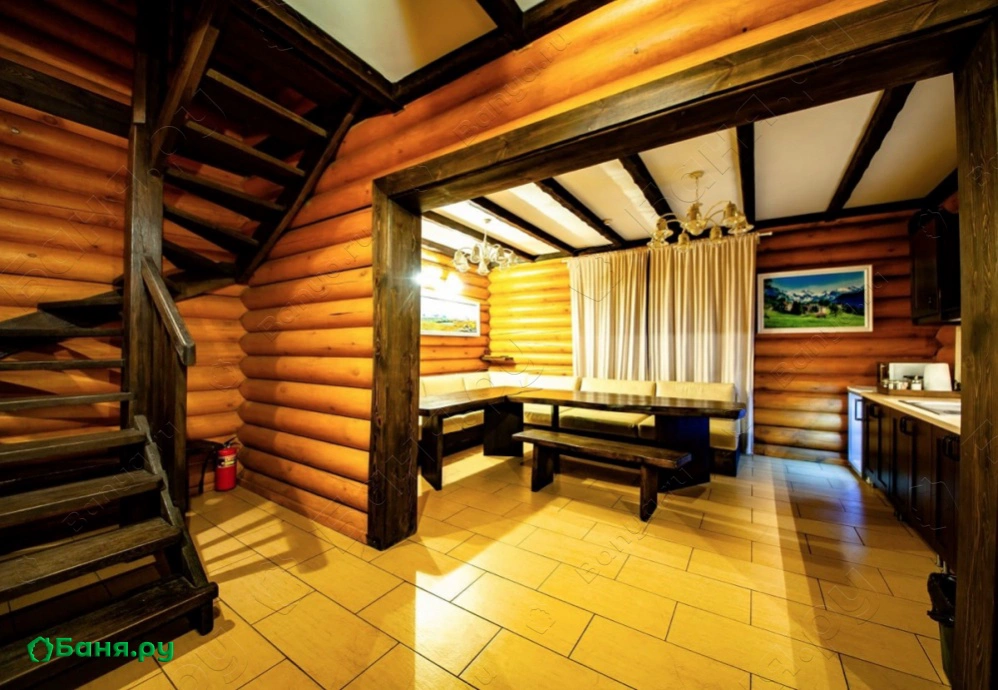 г. Уфа, ул. Красная ул., 1А Дом "Премиум" - большой двухэтажный деревянный дом. В гостиной большой стол и угловой диван.