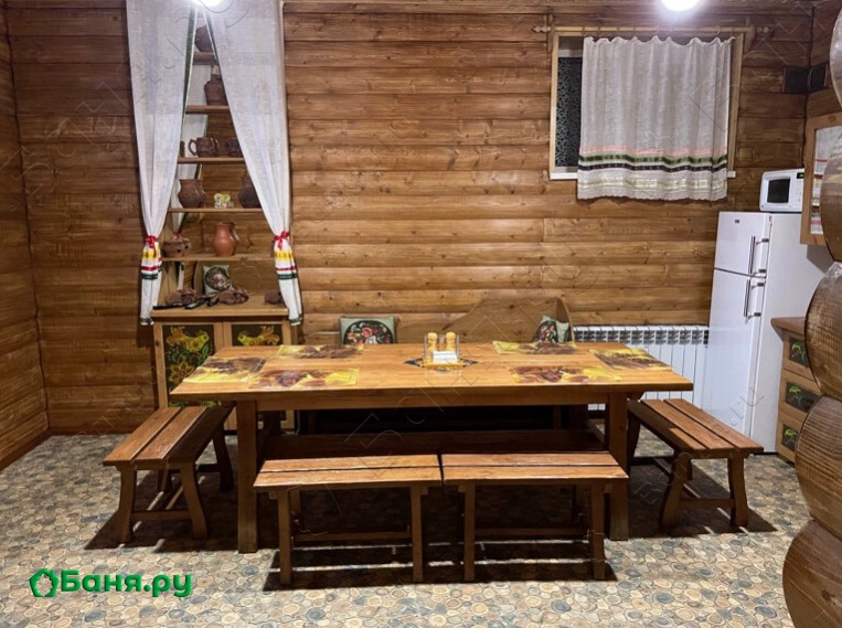 Широкие шторы защитят гостей от яркого солнца и дождя. Большой стол и лавки примут 12-15 человек.