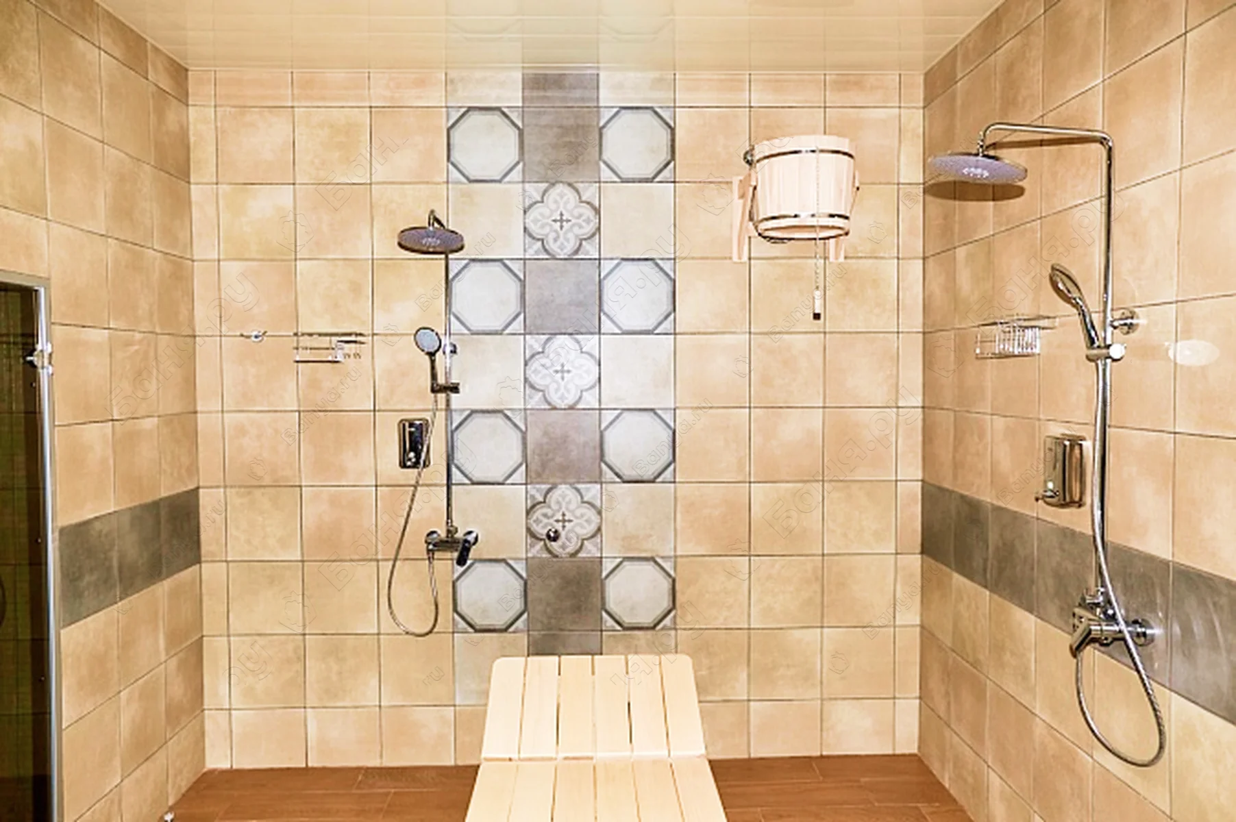 - 2 душевые стойки со стационарными душевыми лейками и дополнительными лейками на гибких шлангах